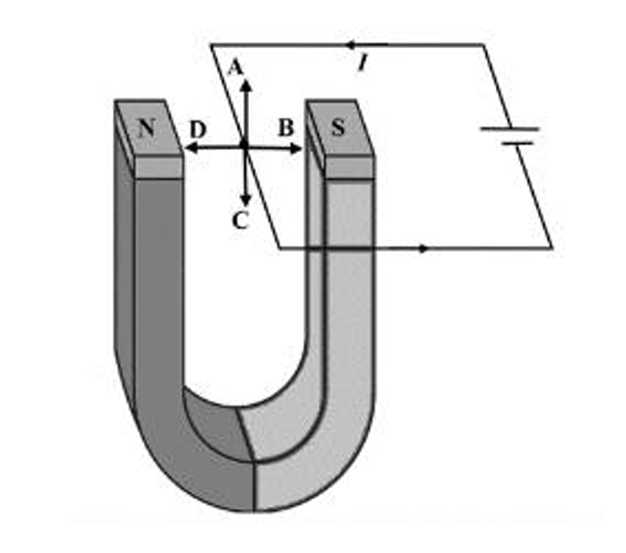Theo quy tắc ra bắc vào nam (ra N vào S) thì đường sức từ hướng sang phải trong nam châm hình chữ U. Áp dụng quy tắc bàn tay trái được lực từ tác dụng lên dây dẫn theo hướng A.