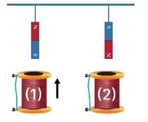 Câu 12 [1043930]: Hai nam châm được treo cố định, phía trên hai ống dây dẫn kín như hình vẽ. Ống dây (1) được dịch chuyển theo chiều mũi tên, ống dây (2) đứng yên. Dòng điện cảm ứng