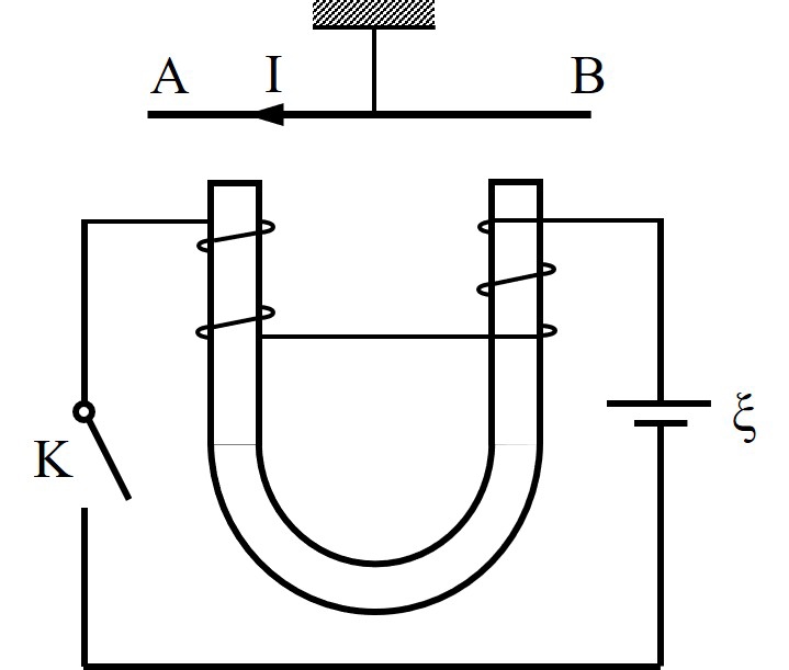 Câu 8 [1043634]: Dây dẫn thẳng AB đang mang điện được treo ngay phía trên một nam châm điện hình chữ
