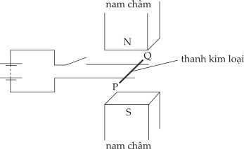 Câu 13 [862574]: Một thanh kim loại PQ nằm trên hai dây kim loại ngang được gắn vào một pin. Thanh nằm giữa các cực của một nam châm. Khi công tắc được đóng, thanh di chuyển sang phải.