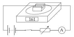 Sơ đồ cho thấy một dây dẫn thẳng nằm ngang được kẹp chặt, mang dòng điện được giữ ở giữa hai cực của một nam châm trên cân đĩa trên. Dây vuông góc với hướng của các đường sức từ. Khi ngắt khóa K, số chỉ của cân là 150 g. Khi đóng khóa K số chỉ của cân là 161 g.
