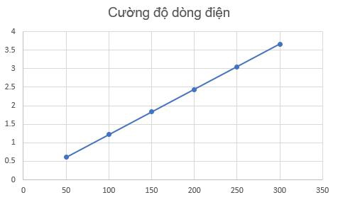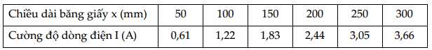 Một giáo viên tiến hành thí nghiệm khảo sát số chỉ R của cân lò xo thay đổi như thế nào theo cường độ dòng điện chạy qua thanh đồng thu được bảng như sau