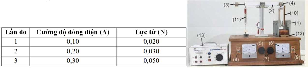 Câu 22 [1043364]: Một học sinh làm thí nghiệm đo cảm ứng từ của một nam châm như hình bên. Điều chỉnh khung dây vuông góc với cảm ứng từ của nam châm điện. Chiều dài tương đương của đoạn dây dẫn đặt trong từ trường là 20 m . Khi thay đổi dòng điện qua khung dây thì đo được giá trị lực từ qua lực kế cho ở bảng sau