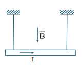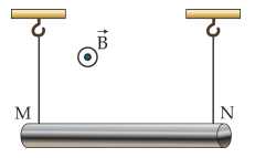 Treo đoạn dây dẫn MN có chiều dài ℓ = 25 cm, khối lượng của một đơn vị chiều dài là 0,04 kg/m bằng hai dây mảnh, nhẹ sao cho dây dẫn nằm ngang, biết cảm ứng từ có chiều như hình vẽ, có độ lớn B = 0,04 T. Cho g = 10 m/s2.