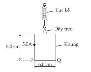 Câu 32 [1049129]: Một sợi dây kim loại cứng được dùng để tạo thành một khung hình chữ nhật có kích thước 8,0 cm x 6,0 cm. Khung này hở ở phía trên và được treo bằng một lực kế như minh họa hình vẽ.