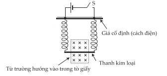 Sơ đồ cho thấy một thanh kim loại được treo trong từ trường bởi hai lò xo dẫn thẳng đứng. Pin và thanh có điện trở không đáng kể. Đóng công tắc S.
