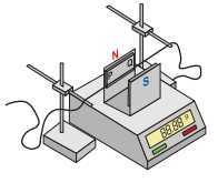Câu 25 [1049128]: Một nam châm được đặt trên cân. Một đoạn dây dẫn cứng được giữ cố định, nằm ngang, vuông góc với các đường sức từ của từ trường đều giữa hai cực của nam châm (hình bên). Cảm ứng từ