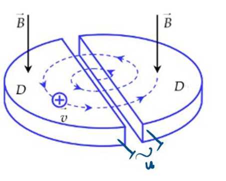 , đường sức từ vuông góc với mặt hộp D (như hình vẽ). Đặt một điện áp xoay chiều thích hợp u vào máy để các hạt điện tích được tăng tốc khi mỗi lần chúng bay qua khe. Trong thí nghiệm, một chùm hạt được gia tốc, thời gian mỗi lần một điện tích q chuyển động được 0,5 vòng trong hộp D là
