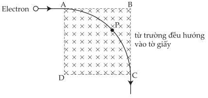 Câu 16 [1049131]: Một electron chuyển động với vận tốc 1,2.107 m/s đi vào một vùng hình vuông ABCD có từ trường đều 0,01 T hướng vào tờ giấy như hình vẽ bên dưới. Electron vẽ một phần tư hình tròn từ A đến C và thoát ra khỏi C với cùng vận tốc. Bỏ qua tác dụng của trọng lực. Điện tích electron là 1,6.10-19 C.