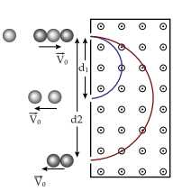 thì lực từ tác dụng lên hạt có độ lớn F =|q|v0B. Bỏ qua tác dụng của trọng lực và lực cản, quỹ đạo của hạt có dạng là đường tròn. Ứng dụng được sử dụng trong khối phổ kế Brainbridge như hình vẽ để xác định khối lượng của chất trong mẫu.