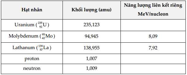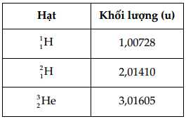 Dữ liệu về các hạt nhân được đưa ra trong bảng sau: