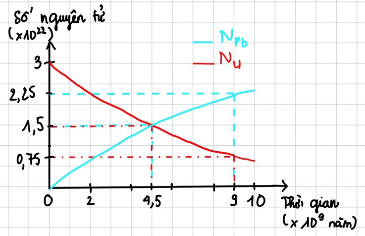 i) Sau mỗi chu kì, số hạt nhân Pb giảm 1 nửa còn số hạt nhân U sinh ra sẽ bằng số hạt nhân Pb phân rã