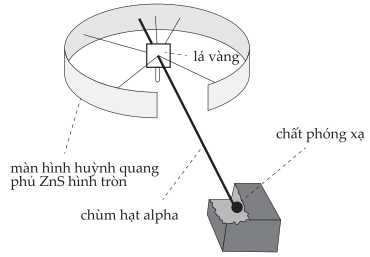 i) Lớp phủ huỳnh quang kẽm sunfua (ZnS) trên màn hình tròn: ZnS là chất huỳnh quang: khi hạt α va chạm vào nó sẽ phát ra một tia sáng rất nhỏ (tia lấp lánh). Nhờ đó người thí nghiệm có thể quan sát và đếm từng pha (tia sáng) để biết hạt α bị dội về hướng nào và với tần suất ra sao.