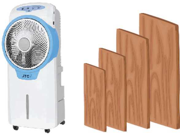 Hình vẽ bên là hình ảnh của quạt điều hoà (còn gọi là quạt nước) và các tấm Cooling Pad. Cấu tạo của quạt có 5 bộ phận chính gồm: bình nước, máy phun hơi nước, tấm Cooling Pad, tấm giữ bụi, động cơ gắn với cánh quạt. Tấm Cooling Pad chính là bộ phận quan trọng, được thiết kế dưới dạng hình khối chữ nhật với các rãnh nhằm tiếp xúc với nước, đồng thời giữ nước lại. Tấm màng này chiết xuất từ vỏ cây nên khả năng thẩm thấu tương đối nhanh.