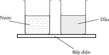 Câu 14 [862383]: Hình vẽ cho thấy một lò sưởi điện đang được sử dụng để đun nóng một cốc nước và một cốc dầu giống hệt trong vài phút.