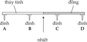 Câu 13 [862478]: Một thanh được làm một nửa bằng thủy tinh và một nửa bằng đồng. Bốn chiếc đinh, A, B, C và D được gắn vào thanh bằng sáp. Thanh được làm nóng ở giữa như hình vẽ.