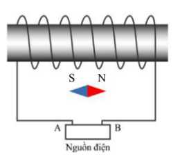 Câu 5 [835109]: Xét một ống dây thẳng dài có dòng điện chạy qua và một nam châm thử định hướng như hình dưới. Biết A và B là các cực của nguồn điện không đổi. Phát biểu nào sau đây là đúng?