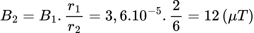 Dòng điện chạy qua một dây dẫn thẳng dài đặt nằm ngang trong không khí gây ra tại một điểm cách nó 2 cm một cảm ứng từ có độ lớn 3,6.10–5 T. Độ lớn của cảm ứng từ do dòng điện này gây ra tại điểm cách nó 6 cm là bao nhiêu μT?