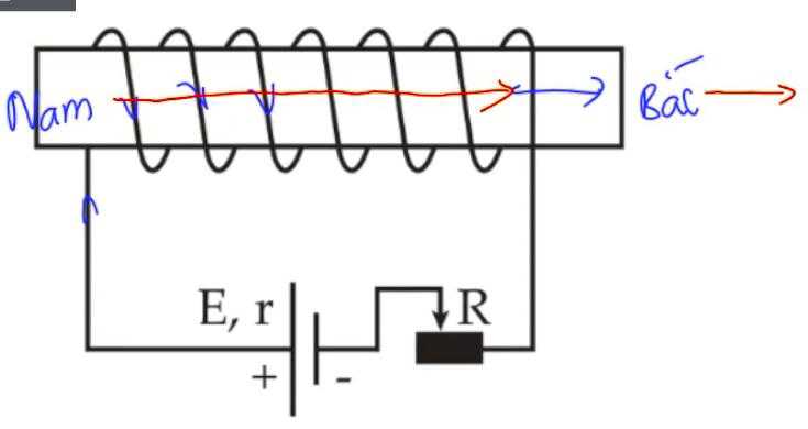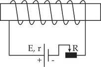 Cho một ống dây dẫn dài nằm ngang như hình vẽ bên, hai đầu dây được nối với nguồn điện một chiều có suất điện động E, điện trở trong r, biến trở R. Ống dây sinh ra từ trường có độ lớn cảm ứng từ trong lòng ống dây tỉ lệ thuận với cường độ dòng điện chạy qua và mật độ vòng dây theo chiều dài của ống dây.