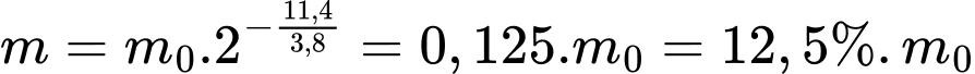 Câu 28 [863062]: Một chất phóng xạ có chu kỳ bán rã là 3,8 ngày. Sau thời gian 11,4 ngày thì khối lượng của lượng chất phóng xạ còn lại bằng bao nhiêu phần trăm so với khối lượng của lượng chất phóng xạ ban đầu?