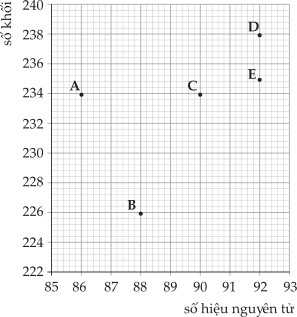 Đồ thị dưới đây biểu thị số khối và số hiệu nguyên tử, hạt nhân của 5 nguyên tử khác nhau.