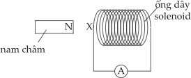 Câu 12 [863126]: Một ống dây được nối nối tiếp với một ampe kế nhạy. Cực bắc của một nam châm được đặt cạnh một đầu của ống dây, được đánh dấu X.