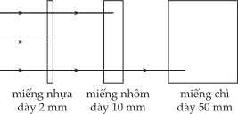 Với thứ tự các tia từ trên xuống lần lượt là X, Y, Z thì ta có: Y không thể xuyên qua miếng nhựa dày 2mm nên đây là tia α, X xuyên qua được miếng nhựa dày 2mm nhưng không thể xuyên qua miếng nhôm dày 10mm nên đây là tia β, Z có thể đi qua miếng nhựa và miếng nhôm nhưng bị chặn lại bở miếng chì nên Z là tia γ