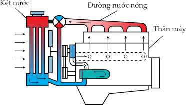 Câu 7 [863161]: Hình bên là sơ đồ nguyên lí hoạt động của hệ thống làm mát bằng nước. Nước được dẫn đến thiết bị cần làm mát (thân máy), hấp thụ nhiệt từ thiết bị đó và tăng nhiệt độ. Nước nóng được đưa đến két nước rồi đưa qua dàn làm lạnh để giảm nhiệt độ rồi được đưa trở lại thiết bị cần làm mát để tiếp tục quá trình hấp thụ nhiệt. Phát biểu nào dưới đây sai?