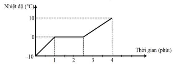 Câu 23 [828723]: Đồ thị hình bên dưới mô tả quá trình đun nóng một khối nước đá. Dựa vào đồ thị, hãy xác định thời gian diễn ra quá trình nóng chảy của khối nước đá theo đơn vị phút.
