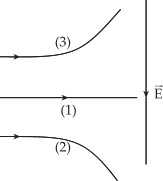 Câu 18 [863219]: Máy gia tốc có thể cho các hạt mang điện tới tốc độ đủ lớn rồi cho va chạm (hay còn gọi là tán xạ) với hạt khác mà người ta gọi là hạt bia tạo ra hạt mới để tìm hiểu cấu trúc của vật chất. Trong một quá trình tán xạ như vậy, người ta cho các hạt mới sinh ra đi qua điện trường đều để kiểm tra điện tích của chúng và xác định được quỹ đạo như hình vẽ. Cho biết nhận định nào sau đây là đúng?