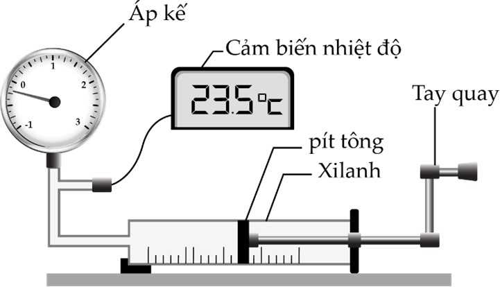 Câu 8 [863206]: Trong thí nghiệm khảo sát mối liên hệ áp suất - thể tích của một khối lượng khí xác định khi nhiệt độ không đổi, người ta bố trí thí nghiệm như hình bên. Các thao tác thí nghiệm: