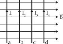 Câu 11 [863210]: Bốn đoạn dây dẫn a, b, c, d có cùng chiều dài ℓ, được đặt vuông góc với vectơ cảm ứng từ B trong từ trường đều, mang dòng điện có cường độ I1 > I2 > I3 > I4 (hình vẽ). Lực từ do từ trường đều tác dụng lên đoạn dây dẫn nào là yếu nhất?