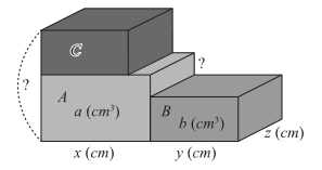 có chiều dài, chiều rộng và thể tích được cho như hình vẽ. Hình B và C có kích thước giống nhau, hình A có cùng chiều rộng với B và C.