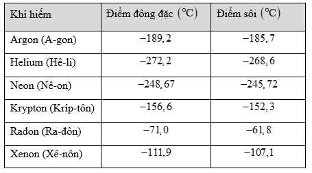 Câu 21 [1039213]: Bảng sau cho biết các điểm đông đặc và điểm sôi của sáu nguyên tố được gọi là khí hiếm.