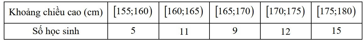 Khảo sát chiều cao (cm) của 52 học sinh khối 11 thu được mẫu số liệu ghép nhóm sau: