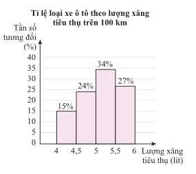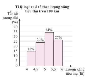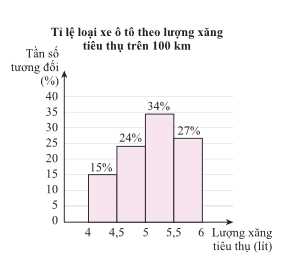 Tần số tương đối của những chiếc xe tiêu thụ hết từ 5 đến 5,5 lít xăng khi đi hết quãng đường 100 km là 34%.