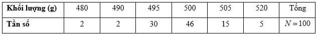 Câu 2 [1037966]: Nhà máy kiểm tra 100 sản phẩm của một dây chuyền đóng gói kẹo đang trong thời gian chạy thử nghiệm. Tiêu chuẩn là một gói nặng 500 gam. Những gói kẹo có khối lượng chênh lệch không quá 10 gam so với tiêu chuẩn được xem là đạt yêu cầu. Kết quả kiểm tra được thống kê trong bảng sau: