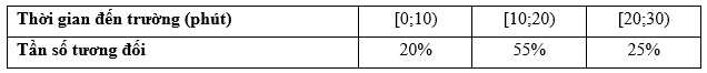 Câu 5 [1038351]: Cho bảng tần số tương đối ghép nhóm về thời gian đi từ nhà đến trường của học sinh lớp 9A như sau: