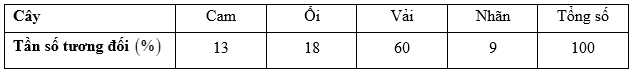 Câu 3 [1037967]: Bảng dưới đây ghi lại tỉ lệ % số cây ăn quả trong trang trại của bác Kiên: