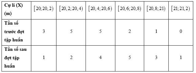 Câu 10 [1038356]: Bảng dưới đây ghi lị cự li ném tạ (đơn vị: mét) của một vận động viên trước và sau một đợt tập huấn đặc biệt: