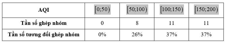 Lập bảng tần số ghép nhóm và bảng tần số tương đối ghép nhóm theo chỉ số AQI cho dãy dữ liệu trên.