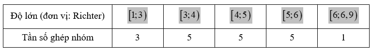 Lập bảng tần số ghép nhóm cho độ lớn các trận động đất xảy ra ở vùng này theo thang Richter.