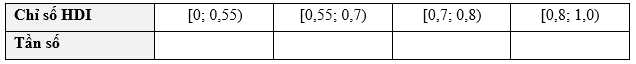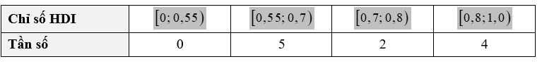 Câu 11 [1038377]: Chỉ số phát triển con người (HDI) là chỉ tiêu tổng hợp phản ánh các mặt thu nhập, sức khỏe, giáo dục của người dân trong một quốc gia. Các nước và vùng lãnh thổ trên thế giới được chia thành bốn nhóm theo HDI: Nhóm 1 (rất cao) có HDI từ 0,8 trở lên; Nhóm 2 (cao) có HDI từ 0,7 đến dưới 0,8; Nhóm 3 (trung bình) có HDI từ 0,55 đến dưới 0,7; Nhóm 4 (thấp) có HDI dưới 0,55. Năm 2021, chỉ số HDI của 11 quốc gia Đông Nam Á như sau: 0,939 0,829 0,803 0,8 0,705 0,703 0,699 0,607 0,607 0,593 0,585.