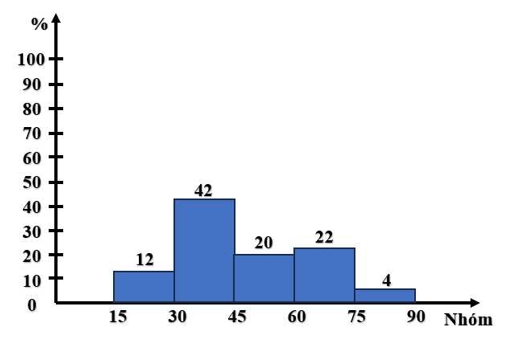 c) Vẽ biểu đồ tần số tương đối ghép nhóm dạng cột biểu diễn bảng số liệu lập ở câu b). Từ biểu đồ, em có nhận xét gì về thời gian dành cho bữa ăn trưa của những người được điều tra?