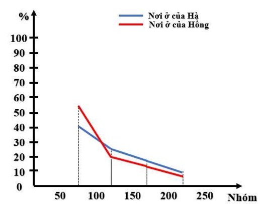 a) Hãy vẽ trên cùng một hệ trục hai biểu đồ dạng đoạn thẳng biểu diễn tần số tương đối cho bảng chỉ số chất lượng không khí tại nơi ở của bạn Hà và nơi ở của bạn Hồng.