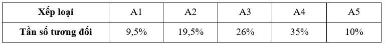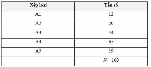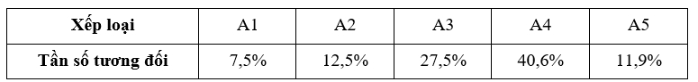 Câu 9 [1038375]: Trung tâm ngoại ngữ Ánh Dương đang triển khai dạy Tiếng Anh theo hai giáo trình mới với mục đích nâng cao năng lực giao tiếp cho học viên. Cuối học kì, toàn thể học viên cùng làm một đề kiểm tra chung. Kết quả kiểm tra được thống kê trong hai bảng dưới đây, với 5 mức xếp hạng từ thấp nhất đến cao nhất, kí hiệu A1. A2. A3, A4, A5: