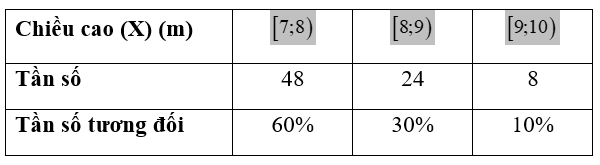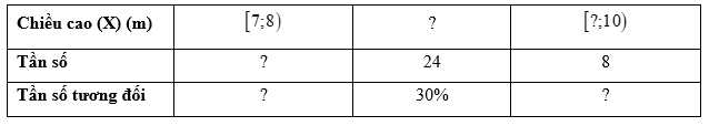 Câu 12 [1038378]: Bác Minh thống kê chiều cao của một số cây bạch đàn 5 năm tuổi ở một lâm trường vào bảng dưới đây (đơn vị: mét). Do sơ suất nên bác Minh ghi thiếu một số dữ liệu. Hãy giúp bác Minh hoàn thành bảng thống kê.