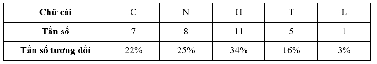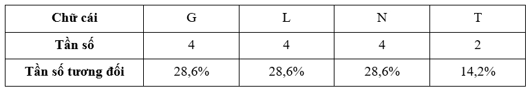 Mẫu dữ liệu thống kê các chữ cái G, L, N, T lần lượt xuất hiện trong hai câu thơ trên là: