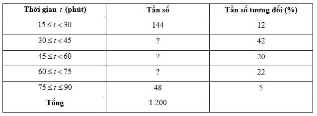 Câu 15 [1038381]: Bảng dưới được thiết lập để biểu diễn kết quả cuộc điều tra 1 200 người về thời gian họ dành cho bữa ăn trưa hàng ngày: