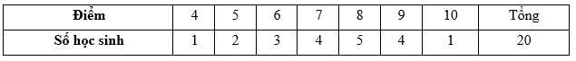 Cho bảng số liệu điểm kiểm tra môn Toán của 20 học sinh.